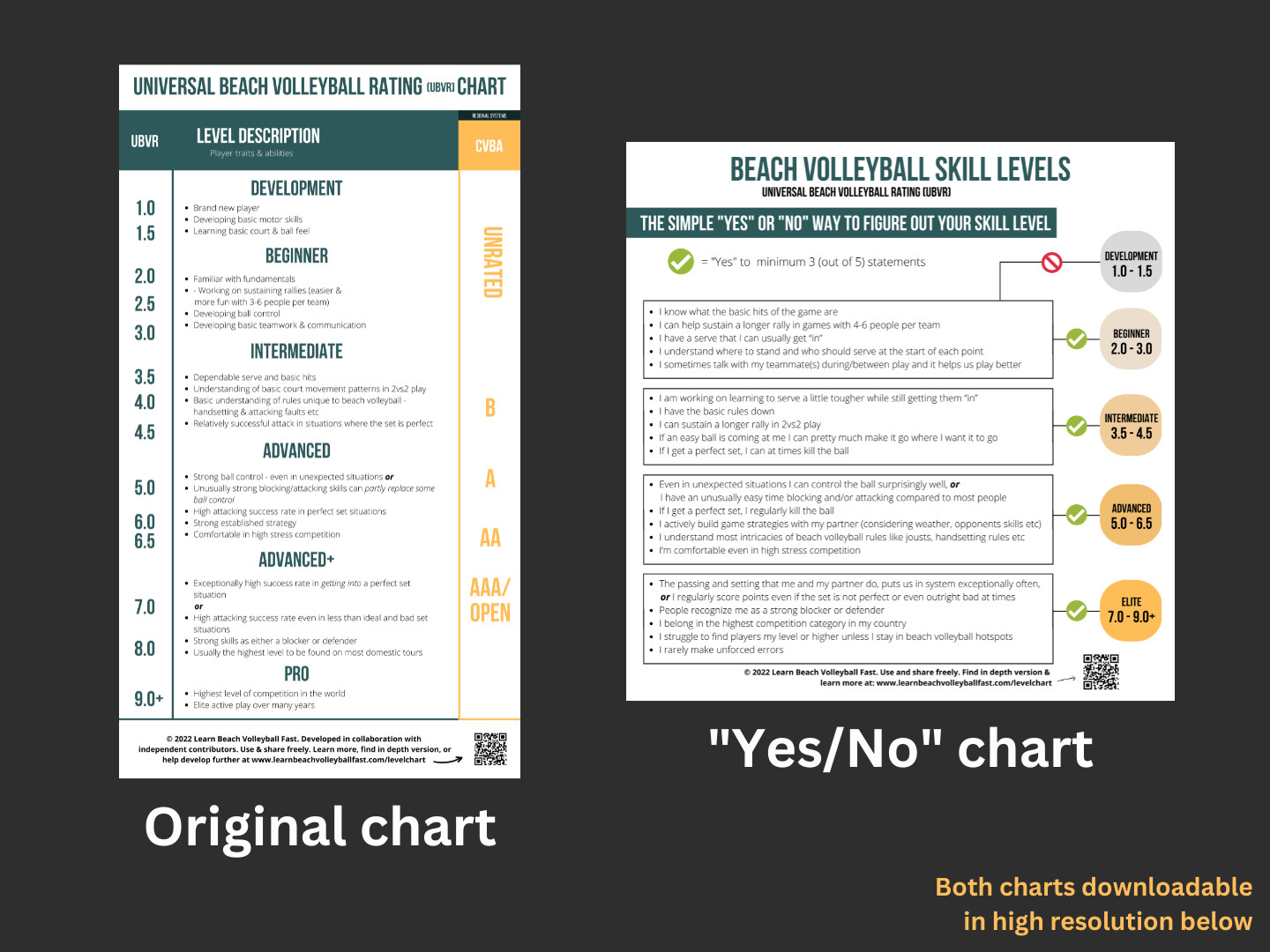This is why I decided to create the Universal Beach Volleyball Rating system - a system that describes common characteristics of players at different levels, so that all players can relatively quickly figure out their “rating”, which then makes it easy to communicate this rating to other people.